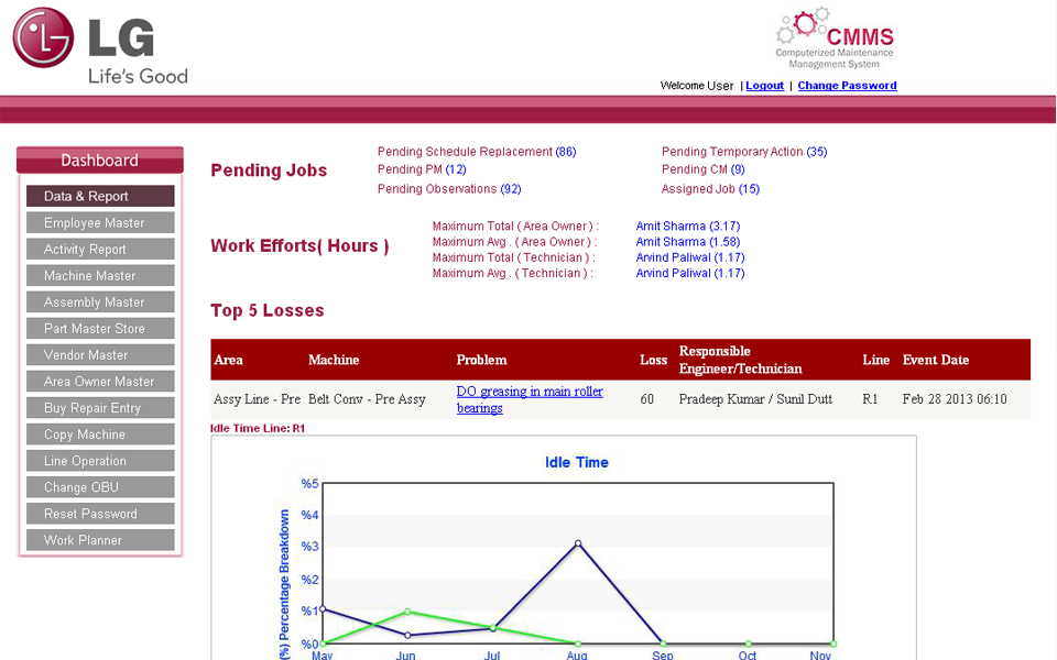The application was developed for LG a renowned name in consumer durables. The application acts as a centralized storage of information consisting of historical maintenance and repair information. It also has the aspect of preventive maintenance for effectively managing the proactive maintenance, which in turn reduces the downtime of machinery. It has a set of